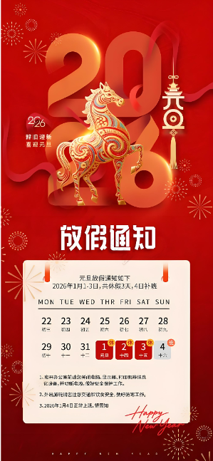 根据《国务院办公厅关于2026年部分节假日安排的通知》,结合公司实际情况,现将2026年元旦放假安排通知如下:2026年1月1日(星期四)至1月3日(星期六)放假,共3天。2026年1月4日上班